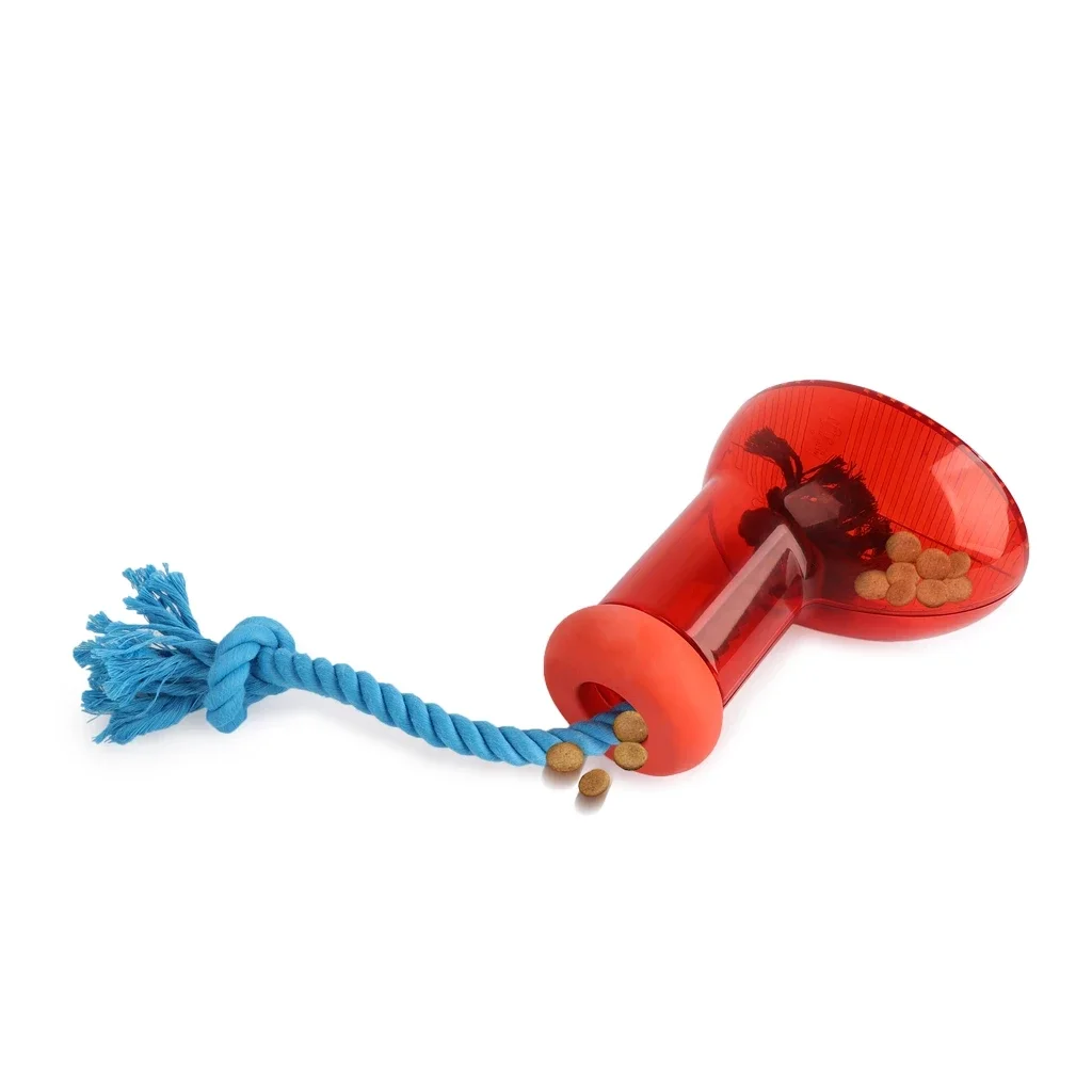 Deze voer of snack dispenser houdt honden urenlang bezig! Draai de bovenkant van de laars af, doe een paar brokjes of snacks in de laars en draai de bovenkant er weer op. De hond moet goed zijn of haar best doen om de lekkernijen langs het touw uit de opening aan de bovenzijde te krijgen. Dankzij het touw kan de hond de laars makkelijk vastpakken en verplaatsen. Ideaal als de hond zich verveelt, alleen thuis moet zijn of als beloning.