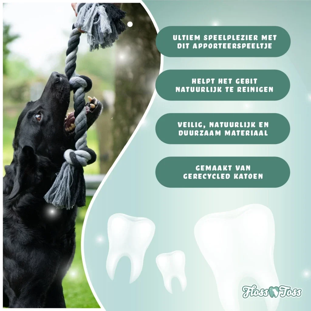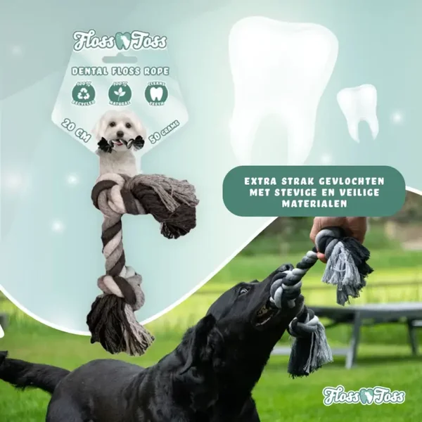 Het is speciaal ontworpen voor apporteer- en trekspelletjes met honden. Tijdens het spelen helpt het flostouw niet alleen om de gezondheid van de mond van je hond te verbeteren, maar ook om de tanden en tandvlees te reinigen. Dit komt door de speciaal ontworpen vlechtwerktechniek die gebruikt wordt, waarbij alleen hele draden worden gebruikt, waardoor het flostouw strakker gevlochten is en veel sterker dan reguliere flostouwen.
