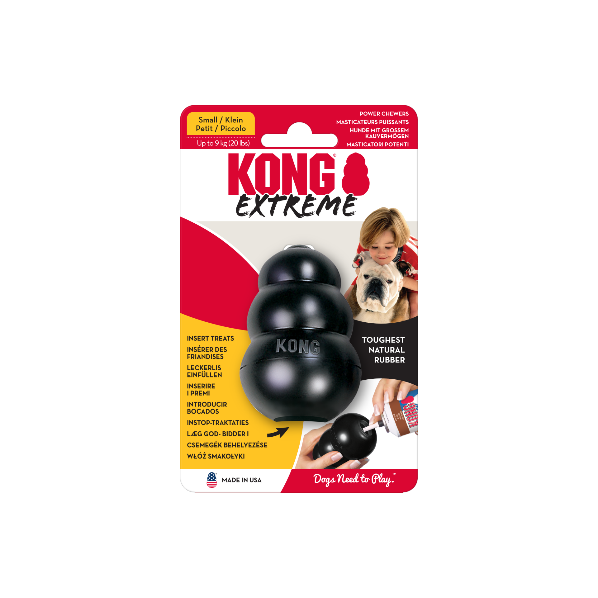 Het KONG Extreme hondenspeeltje toont de meest duurzame sterkte van KONG-rubber. De KONG Extreme is ontworpen voor de zwaarste kauwers en biedt verrijking en helpt het de instinctieve behoeften van honden te bevredigen. De unieke, ultra-duurzame, volledig natuurlijke rubberformule van KONG is ontworpen voor vastbesloten kauwers, terwijl het leuke gestuiter voldoet aan de speelbehoefte van een hond. Wilt u het speelplezier verlengen? Zorg ervoor dat u het vult met verleidelijke brokjes en een scheutje pindakaas. Voor meer speelplezier, voeg KONG Snacks toe met KONG Easy Treat. Vul en bevries voor duurzaam plezier.