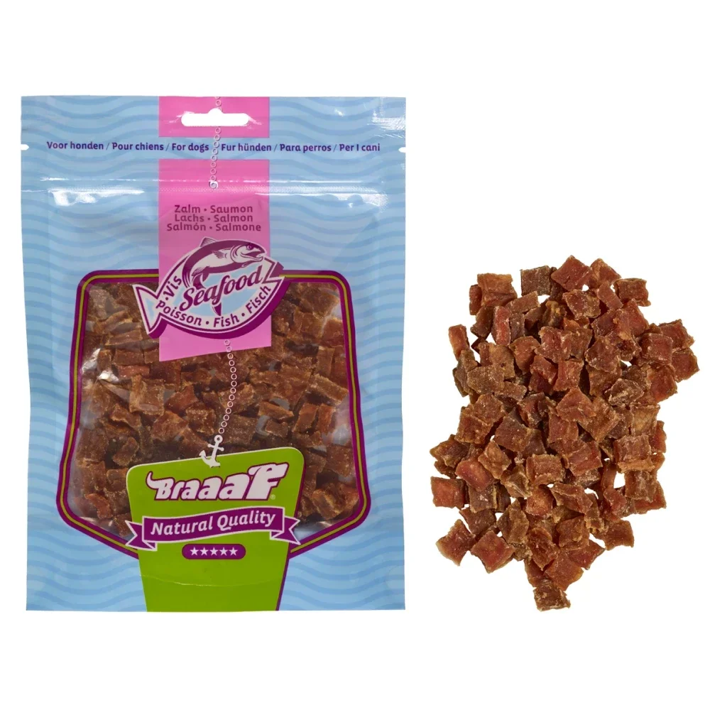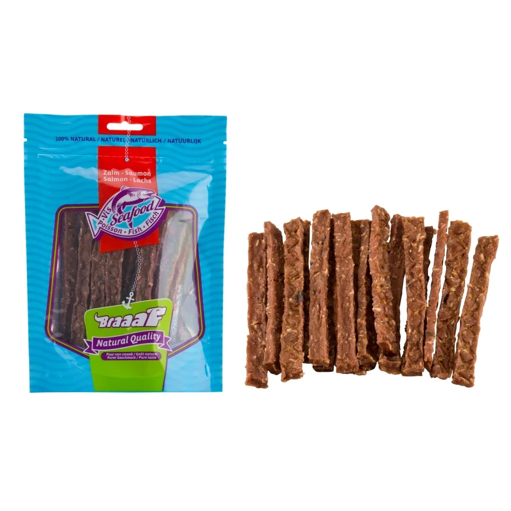Hiervoor is de Seafood lijn van Braaaf de perfecte oplossing. Ook voor alle overige honden zal u merken dat de Seafood producten de voorkeur hebben voor uw hond. Probeer het zelf. 100% aan de lucht gedroogde wilde Alaska zalm met slechts 3,8% vet, essentiële omega-3 vetzuren voor een gezonde huid en vacht. Zonder toevoeging van kunstmatige kleur- en smaakstoffen. Naast het kauwplezier helpt dit product bij de reiniging van de tanden!
