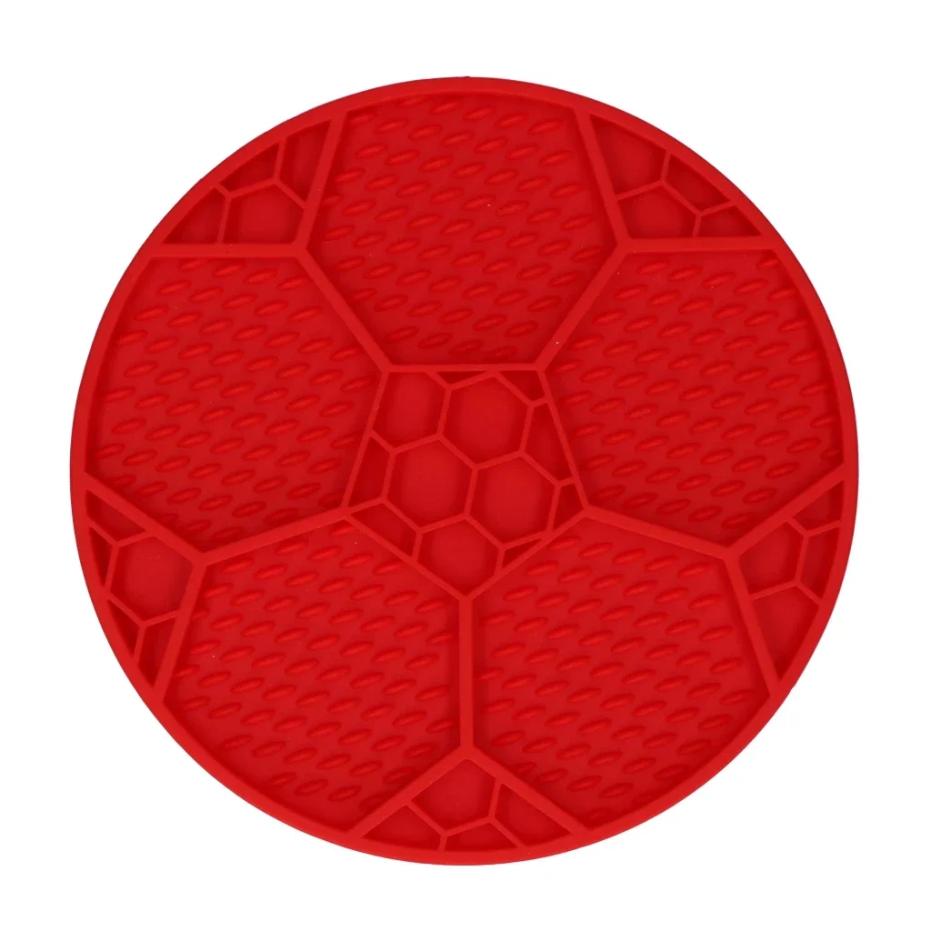 Deze ronde likmat met het patroon van een voetbal maakt het oplikken van al het lekkers extra uitdagend! De hond of kat zal goed zijn best moeten doen om alles in de hoekjes op te likken. Dankzij de zuignapjes aan de onderzijde kun je de likmat goed bevestigen aan een gladde ondergrond, zodat deze niet verschuift terwijl de hond of kat ermee bezig is.