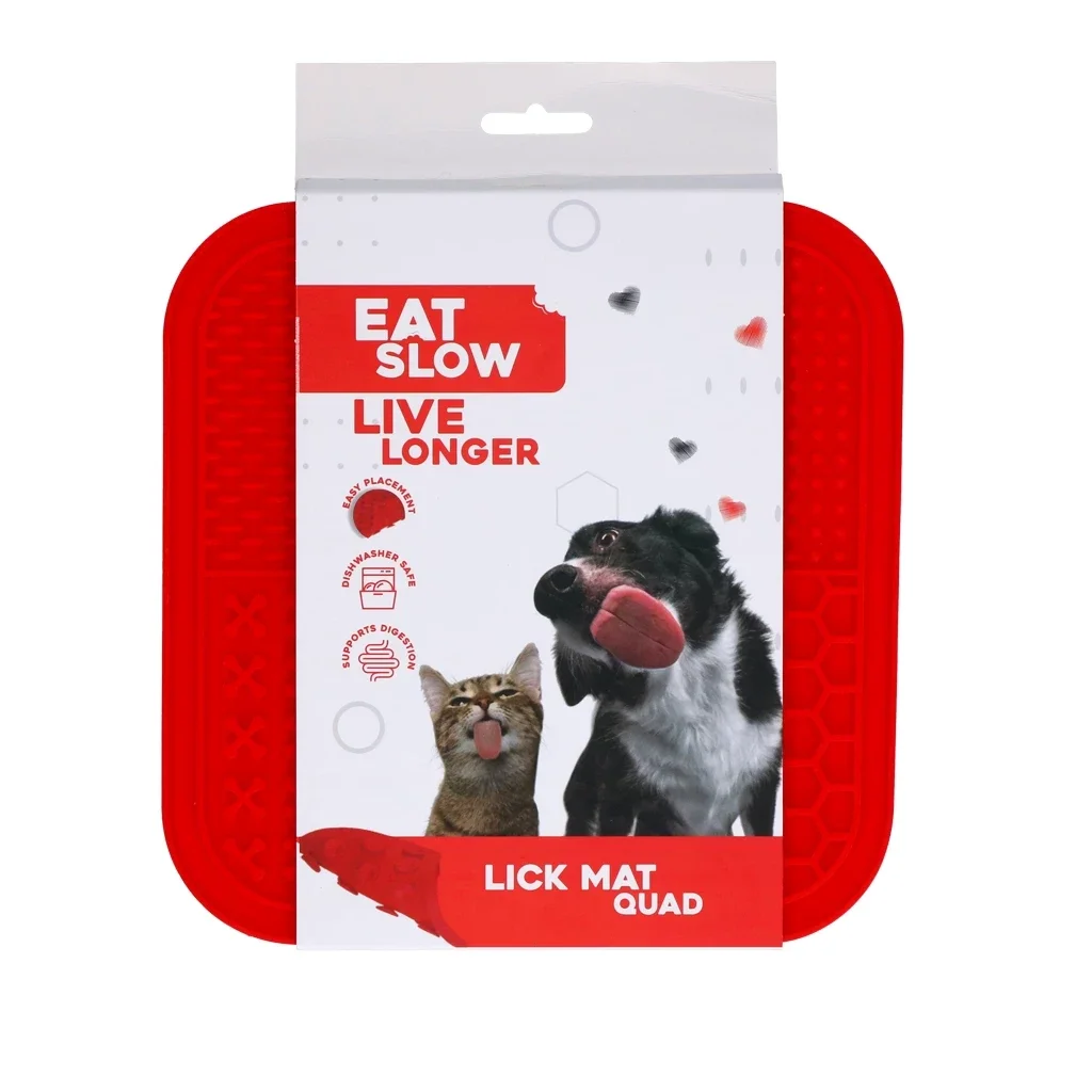 Deze likmat met 4 patronen (grote nopjes, kruisjes, kleine nopjes en honingraat) maakt het oplikken van al het lekkers extra uitdagend! De hond of kat zal goed zijn best moeten doen om alles tussen de nopjes en in de hoekjes op te likken. Dankzij de zuignapjes aan de onderzijde kun je de likmat goed bevestigen aan een gladde ondergrond, zodat deze niet verschuift terwijl de hond of kat ermee bezig is.