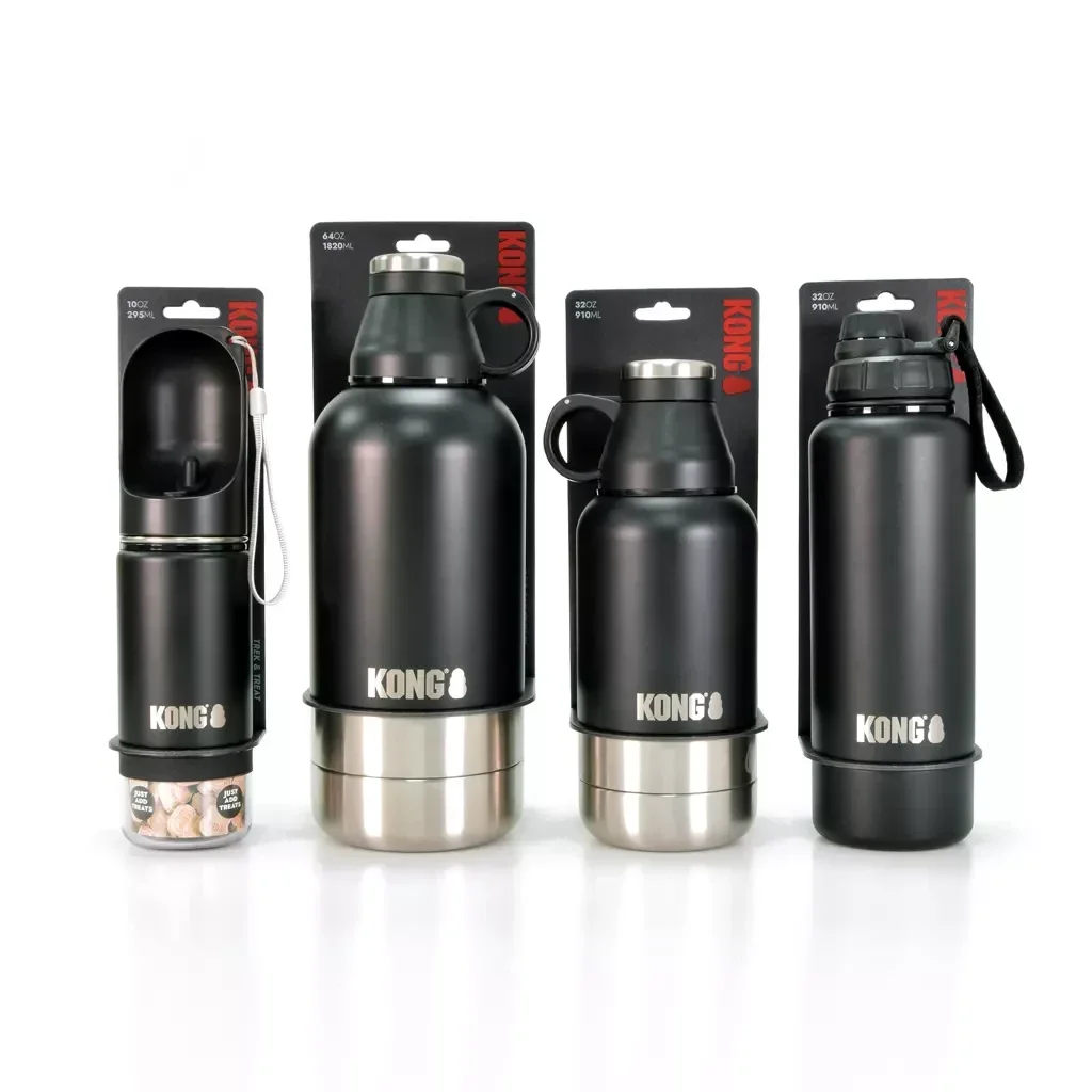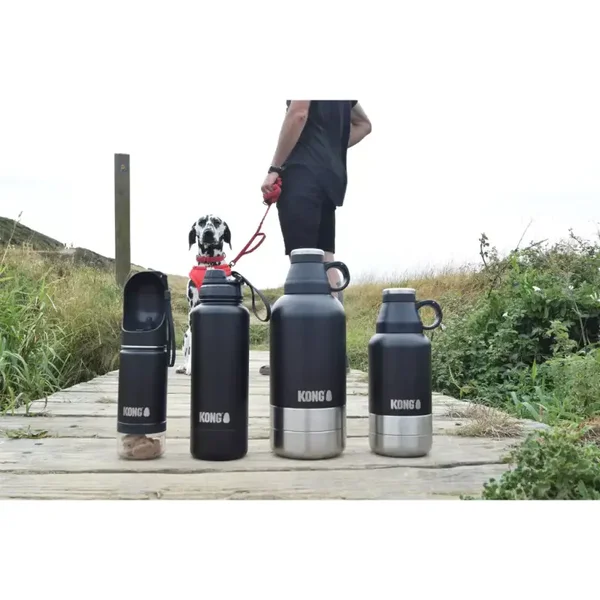 KONG Trek & Treat, dubbelwandige RVS fles met geïntegreerd drinkbakje en apart snackvak, ideaal voor onderweg met de hond.