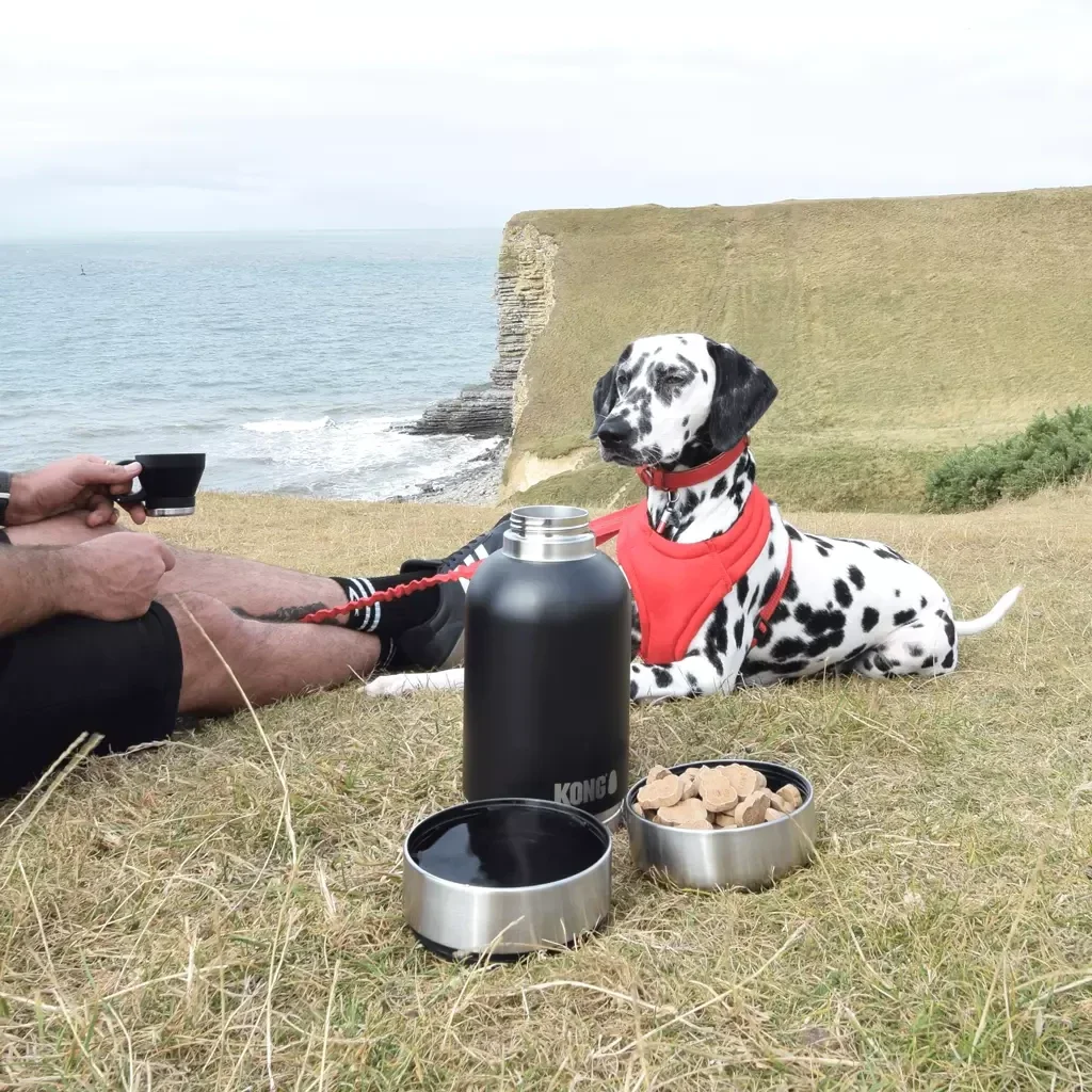 KONG Duo Day Trek, dubbelwandige RVS drinkfles met geïntegreerde bakjes voor voer en water, plus afneembare beker voor het baasje.